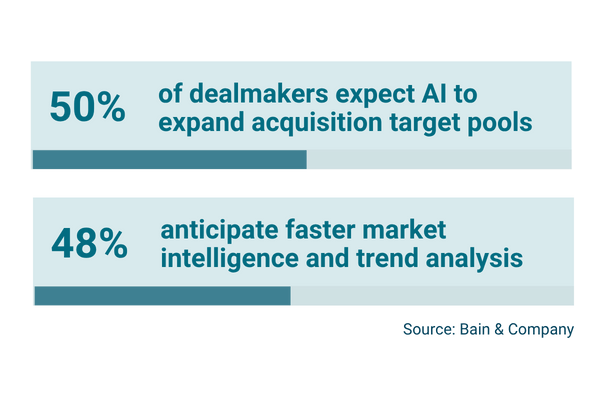Recent survey data from Bain & Company illustrate that dealmakers expect to see AI continuing to add value to the M&A market: